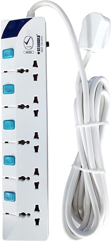 سلك تمديد ستار جولد ، واقي للحمل الزائد ، مخرج تيار متردد 5 ، 3250 واط/13 أمبير ، كابل طاقة طويل 5*1.25 مم/5 متر ، محطة شحن متينة- أبيض