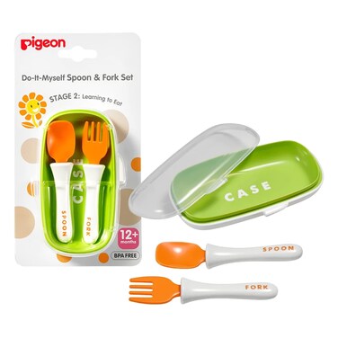 توفر حقيبة السفر المرفقة حلاً صحيًا لتخزين ونقل الأدوات. شجعي طفلك على الاستقلالية ومهارات التغذية الذاتية مع مجموعة الملعقة والشوكة المريحة والملونة.