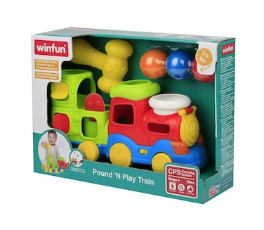 - قطار ملون مع مصباحين أماميين وامضين. اضرب الكرة أسفل الحفرة بالمطرقة وشاهد الكرة تخرج. اسحب القطار لأصوات صافرة وممتعة. تتضمن 3 كرات ملونة ومطرقة.