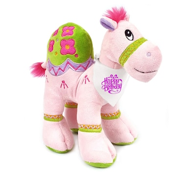 كارافان - جمل وردي 25 سم مع باندانا كريمي مع طبعة عيد ميلاد وردي