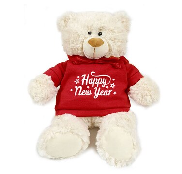 كارافان - دبدوب ناعم للغاية مع هودي أحمر عصري. عام جديد سعيد. الحجم: 38 سم. مثالية لأعياد الميلاد والاحتفالات والأولاد والبنات. ناعم ومحبوب.