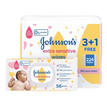 جونسون مناديل مبللة للأطفال شديدة الحساسية بماء نقي، 56 منديل، حزمة من 4