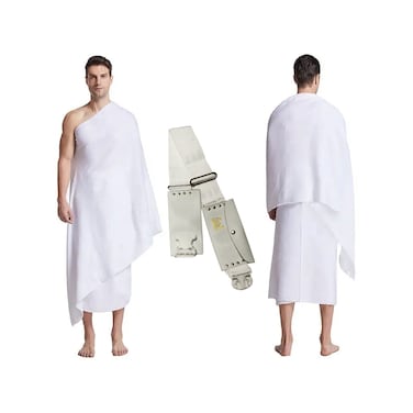 Experience comfort and convenience with the Fabienne 2 Piece Ihram Towel Set for Hajj and Umrah. Made from 100% pure cotton, these soft, absorbent towels ensure a pleasant spiritual experience. Each towel measures 82x42 inches, providing ample coverage, and the set's total weight of 1400 grams guarantees durability. The pure white color symbolizes purity and simplicity, while the non-stitched design maintains a traditional appearance. The belt, available in regular (waist below 34 inches) and plus size (waist above 34 inches), includes two secure pockets for essentials. Easy to wear and quick drying, these towels enhance your pilgrimage with comfort and elegance. Choose Fabienne for quality you can trust.