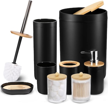 Bathroom Accessories Set 8 Pcs Bamboo Bath Ensemble Includes Soap Dispenser, Toothbrush Holder, Toothbrush Cup, Soap Dish, Qtip Holder Dispenser for Housewarming Gift (8-Bamboo Black)