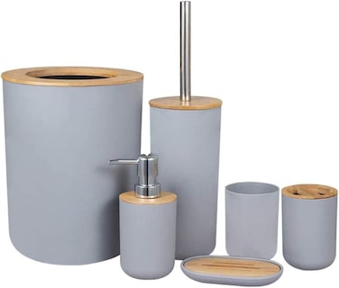 Bathroom Accessories Set, Bamboo, 6 pcs Gift Set Toilet Brush, Soap Dispenser, Waste Bin, Toothbrush Holder, Soap Dish Cup Set, Grey