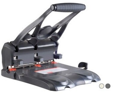 Features: Durable metal construction encased by high impact ABS. Spring assisted high leverage action for easy operation. Punches through 150 sheets of paper. Soft grip handle. Unique mechanism for easy replaceability of spares. Spares storage compartment. Anti skid feet to avoid desk top from scratches. Specifications: Punching Capacity : 150 Sheets. Punching Distance: 108 x 108 mm. Punching Dia: 6 & 7.00 mm. Random Color Selection of (Black-Gray)