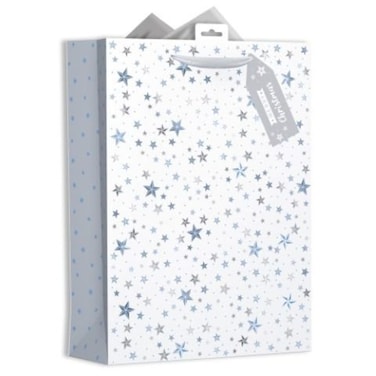With a range of pale blue and grey stars in different sizes with a satin handle, gift tag and matching tissue paper.