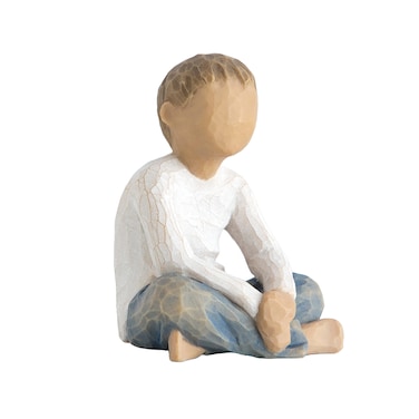 Hand-painted resin figure. Figure of cross-leg seated boy in cream shirt and blue jeans. With arms folded in lap.