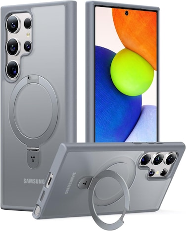 توراس غطاء مغناطيسي بحلقة وحامل لهاتف سامسونج جالاكسي S24 ألترا، متوافق مع MagSafe والشحن اللاسلكي، مقاوم للسقوط بمعيار عسكري، شفاف بحواف ناعمة، سلسلة Ostand Matt، رمادي