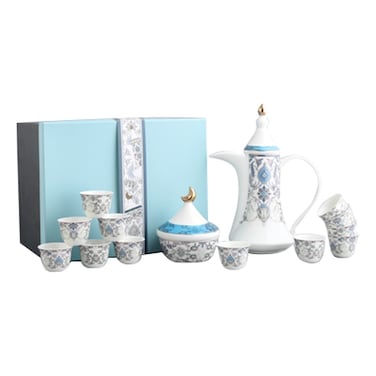 يحتوي الطقم على 6 فناجين قهوة، دلة قهوة تقليدية، وصحن تمر. كل قطعة مصنوعة من البورسلين عالي الجودة وتتميز بتصميمات وأنماط معقدة.