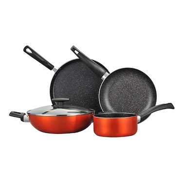 يتميز الطقم بطبقة متينة غير لاصقة تضمن سهولة إخراج الطعام وتنظيفه بسرعة يضيف اللون البرتقالي النابض بالحياة لمسة من الألوان إلى أي مطبخ