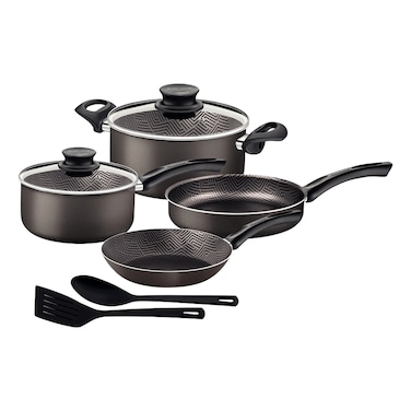 تحتوي المجموعة على طقم متنوع من القدور والمقالي. المقلاة مصنوعة من الفولاذ المقاوم للصدأ عالي الجودة لضمان المتانة وتوزيع الحرارة بشكل متساوٍ. يضمن الجزء الداخلي المانع للإلتصاق سهولة تحرير الطعام والتنظيف السريع.