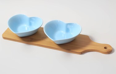 يشمل: 2 صحن على شكل قلب لون أزرق + صينية من خشب البامبو, حجم صينية البامبو: 38 سم طول × 9.3 سم عرض
