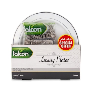 تعتبر أطباق فالكون البلاستيكية الفاخرة الدائرية بحلقة فضية إضافة أنيقة لأي إعداد للطاولة. تم تصنيع هذه الأطباق من البلاستيك العالي الجودة، مما يجعلها متينة وتدوم طويلاً. يضيف تصميم الحلقة الفضية لمسة من الأناقة والتطور إلى تجربتك في تناول الطعام. يبلغ قطر كل طبق 26 سم، مما يجعله الحجم المثالي لتقديم المقبلات أو السلطات أو الأطباق الرئيسية. تتضمن هذه المجموعة 20 طبقًا، لذا سيكون لديك الكثير لجميع ضيوفك.