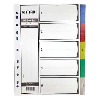 فاصل ملفات ملون من 1 إلى 5 أقسام من مادة البولي بروبيلين باللون الأبيض من ماكسي هي مجموعة من الفواصل المصنوعة من مادة البولي بروبيلين المتينة.