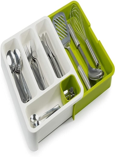 Organise messy cutlery drawers with this practical and smart storage solution. The two halves of the tray can be finely adjusted to fit a variety of drawer sizes and lock securely together once in place. ▮ Includes utensil tray with attachable and expandable cutlery tray; locks into place for functionality ▮ This smart storage solution has four deep-sided compartments that let you separate your knives, forks and spoons, as well as an area for larger utensils or knives plus a handy, movable dish for small loose items. ▮ The Drawer Store fits a wide range of drawer sizes from 11.4-inch up to 18.85-inch. ▮ Expandable area for larger items or utensils It has a movable storage dish for small, loose items ▮ To use, place utensil tray in right hand corner of your drawer. Then, insert the cutlery tray and push down to lock into place. ▮ Wash and dry by hand