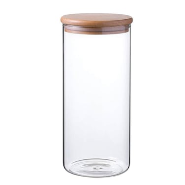 تبلغ سعة البرطمان 1.5 لتر مما يوفر مساحة واسعة لتخزين المكونات الجافة والوجبات الخفيفة أو غيرها من مستلزمات المطبخ يسمح لك الزجاج الشفاف برؤية المحتويات بالداخل بسهولة بينما يضيف غطاء الخيزران لمسة من الأناقة الطبيعية