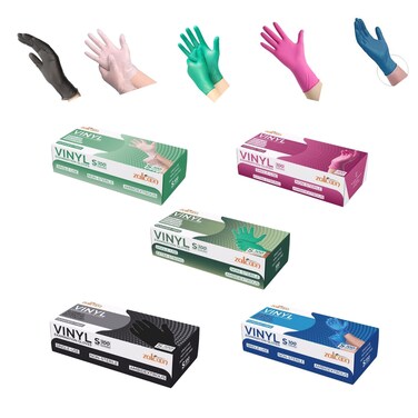 Vinyl Multicolor (Pink, Green, Blue, Black & Clear) Disposable Gloves, Powder-Free, Small, Case of 500 (5 Packs of 100 Pieces)