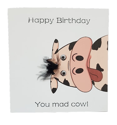 Silly Mad cow Birthday card with a fluffy fringe and googly eyes