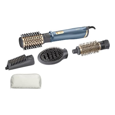 - Includes 4 interchangeable attachments for drying, volumising, smoothing and straightening with a frizz-free finish. Rotating 50mm soft bristle brush, 38mm Thermal brush, straightening attachment, paddle brush, storage pouch