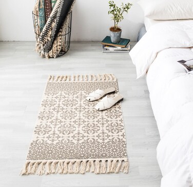 This High Quality Tassel Handwoven Carpet is Made With Linen Cotton Perfect For Bedroom, Living Room, Prayer Room Etc. This Ethnic Style Carpet Will Give Your Home Boho Look. Handmade Woven Rugs With Extra Snazzy Knotted Fringe Tassels On Each Side. Machine Wash, Hand Wash, and Vacuum Clean. Size Of The Tassel Carpet is 60×90CM. This Can Use As Kitchen Rug, Bathroom Rug, Laundry Room, Entry Way Rug, Apartment Rug, Dorm Room Rug and More, It Also Can Be Used As a Decorative Tapestry to Lighten Your Space. Featuring a Tight Weave, Accented with Tonal Shag Tufting in a Boho Mandala Pattern. Finished With Tassel Trim Along The Throw Rug Edges. This Well Designed Bohemian Area Rug is Soft, Breathable and Comfortable On Your Feet, Durable and Stain Resistant, Lightweight and Foldable for Easy Portability and Storage