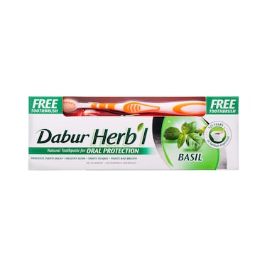 دابر هيربال معجون أسنان بالريحان مع فرشاة أسنان 150 غرام - أبيض