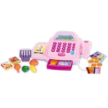 يحتوي على ماكينة تسجيل نقدي واقعية مع آلة حاسبة ،ماسحة ضوئية وميكروفون. تشتمل المجموعة أيضًا على نقود اللعب وبطاقات الإئتمان ومواد البقالة المتنوعة لتجربة تسوق كاملة.