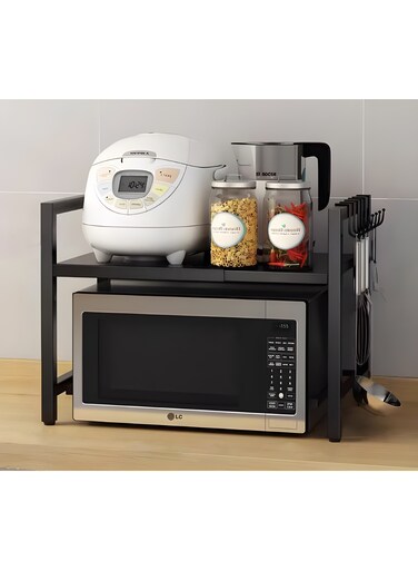 يتكون المنتج من: 1 رف ميكروويف قابل للتوسيع أسود يأتي مع 6 خطافات