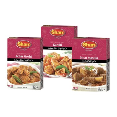 شان مسالا وصفة أشار غوشت 50 غرام مع الكراتشي 50 غرام، و بهارات لوصفة اللحم 100 غرام.