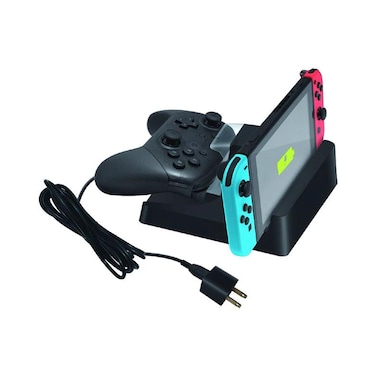 يمكنه شحن كل من وحدة التحكم ووحدات التحكم الخاصة بك في وقت واحد، مما يسمح لك بالحفاظ على إعداد الألعاب الخاص بك منظمًا وجاهزًا للانطلاق. تم تصميم القاعدة باللون الأسود لتتناسب مع جماليات نينتندو سويتش وتتميز بتصميم مدمج لن يشغل مساحة كبيرة على مكتبك أو مركز الترفيه.