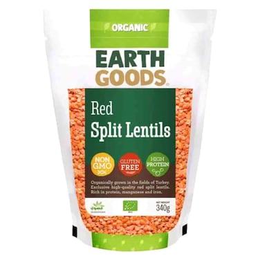 - يقدم عدس إيرث غودز الأحمر المجروش الغير معدل وراثيًا نكهة لذيذة ومغذية