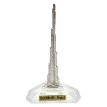 قطعة زينة معدنية صغيرة بتصميم برج خليفة هو تمثال صغير باللونين الفضي والأبيض مصمم ليشبه ناطحة سحاب برج خليفة الشهيرة في دبي