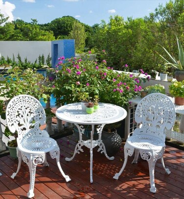 تأتي مجموعة البيسترو البيضاء مع كرسيين جميلين مصممين بالزهور وطاولة واحدة جذابة بنفس القدر باللون الأبيض العاجي، والتي تحظى بشعبية كبيرة بين جيل الشباب.