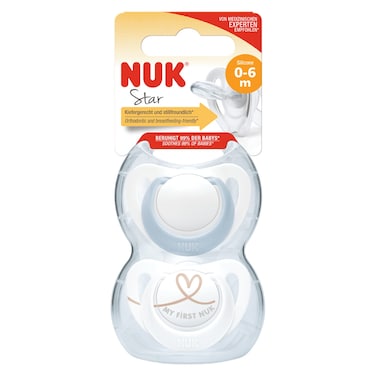 تم تصميمها بدرع على شكل نجمة، مما يضفي لمسة لطيفة إلى جانب تهدئة طفلك. كما أن شكل الحلمة المتوافق مع تقويم الأسنان يعزز التطور الصحي للفم.