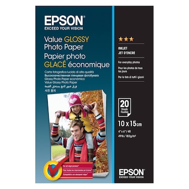 إبسون فاليو أوراق صور فوتوغرافية لامع 20 ورقة - بيضاء هي أوراق صور عالية الجودة مثالية لطباعة صور حية وحادة.
