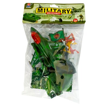 المجموعة تتضمن طائرة عسكرية خضراء مع ميزات وأجزاء قابلة للتحريك واقعية. كما تأتي مع ملحقات عسكرية متنوعة مثل أسلحة الجنود والمركبات.
