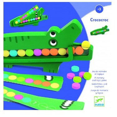 Contents: 1 wooden crocodile, 20 coloured wooden game pieces and 20 cards.
