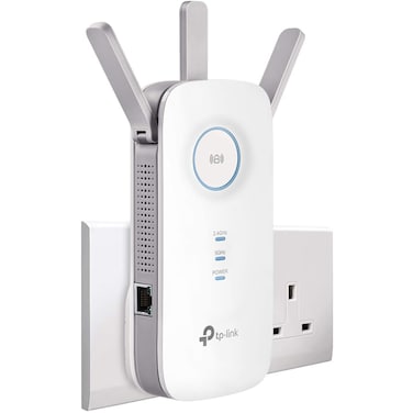 موسع نطاق يونيفرسال مزدوج النطاق AC1750 من تي بي-لينك ، موسع نطاق عريض/واي فاي ، مقوي/نقطة اتصال واي فاي مع منفذ 1 جيجابت و 3 هوائيات خارجية ، وضع نقطة وصول مدمج ، مقبس بريطاني (RE450).