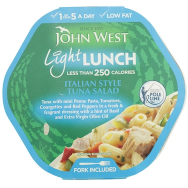 - استمتع بوجبتك مع غداء جون ويست أثناء التنقل مع سلطة التونة على الطريقة الإيطالية مع الكوسة والمعكرونة والطماطم والفلفل الأحمر في الريحان وزيت الزيتون البكر الممتاز (1.3٪) تتبيلة