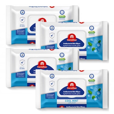 كارفور مناديل مبللة للبشرة بالنعناع البارد مضادة للبكتيريا 40 منديل حزمة من 4 - أبيض