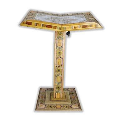 مصنوع من خشب طبيعي متين وعالي الجودة، حامل القرآن هذا مزين بنقوش فسيفساء دمشقية معقدة وأنيقة.