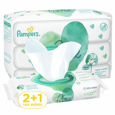 مناديل مبللة اكوا بيور للأطفال من بامبرز 144 قطعة