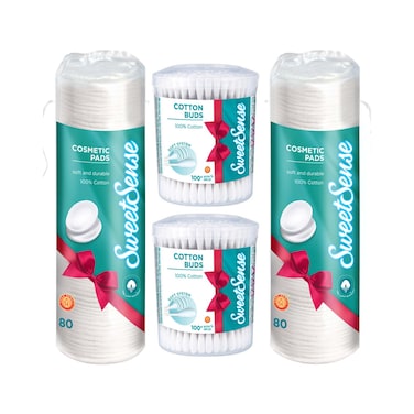 سويت سينس طقم فوط قطنية لتنظيف البشرة 160 فوطة مع أعواد قطنية 200 عود - أبيض