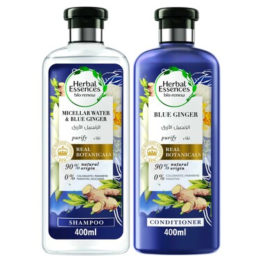 هربال إيسنسيز شامبو بيو رينيو لتنقية الشعر بماء الميسيلار والزنجبيل الأزرق 400 ملل + بلسم 400 ملل