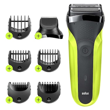 ماكينة الحلاقة الكهربائية براون فئة 3 مع رأس تشذيب و5 أشكال مختلفة 300BT الخضراء هي أداة تصفيف متعددة الاستخدامات للرجال.