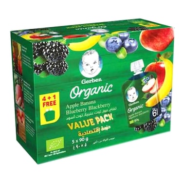 غيربر بيوريه عضوي بالتفاح والموز والتوت الأزرق والتوت الأسود، طعام للأطفال 90 غرام، حزمة من 5