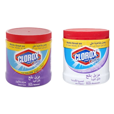 كلوروكس مزيل للبقع ألترا فائق العناية بألوان الملابس 500 غرام، مع مزيل بقع فائق العناية بألوان الملابس 450 غرام.