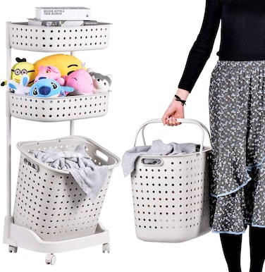سلة غسيل دورين مع فارز بعجلات للغسيل من 3 طبقات مع 6 خطافات جانبية للمطبخ والحمام وحقيبة الملابس القذرة