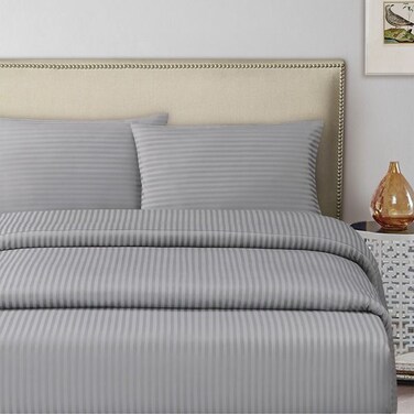 3 Pcs Set Fitted Bed Sheet 200x200cm, 300TC Satin Stripe 100% Cotton, Silver with 2 Pillow Cases