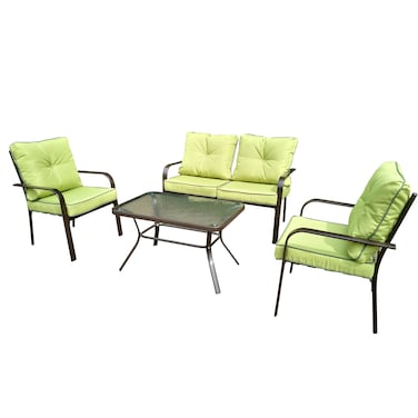 ماي تشويس أوديل طقم الجلوس بالوسائد مع طاولة القهوة وكراسي من الخيزران مع وسائد - أخضر هي مجموعة أثاث خارجية أنيقة وعملية.